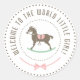 This sticker features a vector graphic with a brown, pink, and green rocking horse, surrounded by dots and a pink bow, and the saying "Welcome to the world little girl". The white background can be customised if desired.