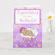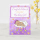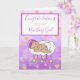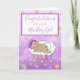 Congratulations on your new baby girl, baby footprints, baby sleeping on the moon purple, pink and gold stars card for new parents. This baby is drawn with darker skin to represent babies of colour such as Hispanic and Indian babies.