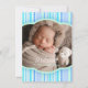 Blue, aqua beads and stripes patterned boys welcome to the world new baby invitation. Not everyone wants a baby shower or be not feel up to it and in some countries it is even seen as bad luck, so if you want to be a little different hold a celebration newborn baby party after your baby has come into the world instead. Personalise with your details and a special photo of your son.