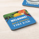 Welcome friends to your home Tiki Bar coaster with your custom name or names. Retro tropical design includes sunset, palm tree, hibiscus flower, and parrot. Edit any text if you like.