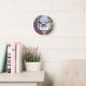 I needed a clock for my bathroom. Yes, my bathroom. So that it would "fit" and look right in the space, I needed something that was frameless, and contemporary. This clock has the water/nature/serene look I wanted. It looks great on my bathroom wall! The blue is well suited to resemble water and the beige matches the vanity. I decided to customize it with inspirational words....perfect! This was my first order, and now, I will certainly come back for future purchases. Very nice, the printing is beautiful and I'm pleased with it.