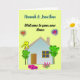 Welcome to your new home card, features a house with trees, flowers, fireworks and a bunch of keys on a yellow background. This card can be personalized by altering the names on the front of the card. The message on the front of the card reads 'Welcome to your new home.