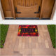 This door mat says "Welcome" in hot pink, the design features palm tree leaf shadows or silhouettes on a fun summer sunset.