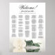 This beautiful wedding seating chart showcases a solitary long-stemmed white, ivory, or cream coloured rose, delicately resting on its side and casting a reflection in a serene pool of water. The title reads "Welcome - please find your table," with the names of the couple and the wedding date positioned below. The chart provides room for up to 200 names, arranged in alphabetical order for effortless navigation by your guests. With its tasteful and refined aesthetics, this design exudes elegance, romance, sophistication, and a touch of chic, adding an air of charm and poise to your wedding celebration.
