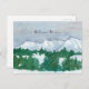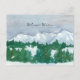 Welcome winter postcard greetings decorated with a winter vista inspired by Rocky Mountains and forest below tucked in with layers of snow and stormy grey sky overhead hand painted with watercolor.