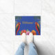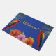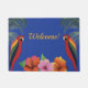 Welcome mat with two bright colourful parrots, hibiscus flowers, and palm tree leaves for your tiki bar, luau or tropical vibe! Add a name or other text under the "welcome" text if you like.