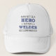 I may not be a hero, but I'm a Welder so close enough humourous word art in sans-serif and doodle cross-hatch font lettering in black and dark royal blue with two distressed accent stars.