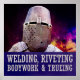 Closeup view of a helmet and a plate armour of a mediaeval knight against the colourful background which imitates the outer space or a battlefield to your liking. Text - Welding, Riveting Bodywork & trueing - added. Square funny poster for anyone.