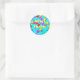 Round award sticker is decorated with colourful stars over a light blue background. This design can be customised. Perfect for school rewards.