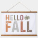This fall-themed design warmly welcomes the autumn season with the phrase "Hello Fall." The words are arranged in a simple yet visually appealing layout, with "Hello" placed above "Fall." Each letter in the phrase is presented in a bold, blocky font with a slightly distressed texture, giving it a rustic, weathered look that complements the autumnal theme.