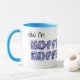 An attractive white ringer mug with a Powder Blue Lip and Handle and 'I like coffee' in the Welsh language'. The letters are filled with a purple. blue and silver-effect geometric pattern. You may prefer to change the background colour by using the Customise button and then the Edit > Background button.