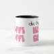 An attractive white ringer mug with a Black Lip and Handle and 'I like coffee' in the Welsh language'. The letters are filled with a pattern of Red and White Check Gingham.