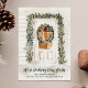 Elegant holiday moving announcement featuring snowy front doorstep with a festive wreath and lighted garland. "We're Decking New Halls" is displayed in a bold green script with your name and address displayed below. The back of the Christmas moving announcement features a green background with white snow flurries.