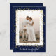 This modern and unique photo engagement party invitation card is perfect to let family and friends know you are engaged and invite them to the party. Send these to your guests with white calligraphy script 'We're Engaged', your photo surrounded by gold glitter hearts on a dark blue background. On the reverse is all your party information. Easy DIY (Do It Yourself) by editing the text in the text boxes on the right side of the screen. Also available in postcard format.