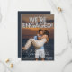 This Save the Date for the wedding announcement features a fun and romantic design. A sample engagement photograph covers the background, which you can replace with your own custom photo or other image of your choice. The phrase, "we're engaged" is printed in silver foil balloons across the top portion. The Save our Date location and day are printed at the bottom in an elegant white font, with extra text printed on the back of the announcement.
