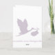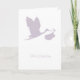 A pregnancy announcement card with silhouette of flying stork in soft lavender purple.