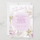 Elegant Pregnancy Announcement Card with botanical design and hand lettering in shades of pink. This announcement card features delicate foliage in watercolor with line drawn gold leaves and gold glitter splashes. "We're expecting" is in handwritten script and your custom message is printed in typewriter typography. The template is set up for you to add your message, including baby's name and due date, along with with name(s).