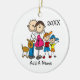 A stick figure expectant couple with two young boys and a big dog, has an area you can add your family name and the date can be changed from 2024 to any year.