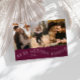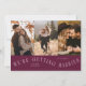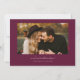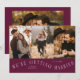 Elegant and modern save the date card featuring a text on a curved path that says "we're getting married." 3 photos on the front and one on the back. The background is cranberry.