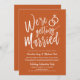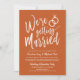 After the big day and the rings are exchanged invite your most honoured guests to an after the wedding celebration. This invitation features the words "We're Getting Married" in fancy script letters over a Terracotta orange colour backdrop. Towards the side of this are a pair of wedding rings. Underneath this unique graphic is a space for your own words and information for your post-wedding event.