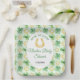 A charming St. Patrick’s Day baby shower plate featuring a soft green background, golden horseshoes, and scattered four‑leaf clovers for a sweet “lucky charm” theme. The central white oval frames the event details beautifully, creating a warm, welcoming design perfect for celebrating a growing family. Ideal for March celebrations, Irish‑inspired themes, or any baby shower that embraces luck, joy, and new beginnings.