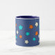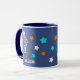 This mug features my hand drawn illustrations. There's a werewolf skeleton riding a BMX bike along with coordinating star graphic is aqua blue, orange and ivory. There's a spot to add a name or other custom text. The name and werewolf appear on both sides of this mug.