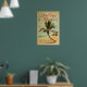 A uniquely retro mid-century modern West Palm Beach Florida art print in vintage travel poster style. It features a curved palm tree on sandy beach with ocean under a blue cloudy sky.