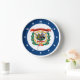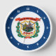 The West Virginia state flag consists of a pure white field bordered by a blue stripe with the coat of arms of West Virginia in the centre, wreathed by Rhododendron maximum and topped by an unfurled red ribbon reading, "State of West Virginia."
