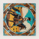 A portrait of a woman on a horse with a desert background and an abstract border.