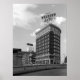 A decorative concrete railing angles across the foreground beginning in the lower left corner of the frame. Aside from a few much shorter buildings to the left of the Western Auto tower, the background is sky with a few clouds.