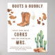 This design features modern neutral colours in a watercolor application. Design in cow print, glass of champagne, desert cactus, cowboy boots.