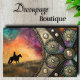 Transform furniture and commercial spaces with our premium western jewellery decoupage paper. This elegant design features ornate silver conchos and a rider silhouette against a vibrant sunset landscape. This design creates an elegant focal point perfect for ranch homes, western boutiques, or equestrian-inspired spaces.