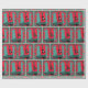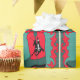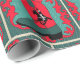Western gift wrapping paper with a cowboy boot that has a roper design on it. The background has teal green with dots patters and a red swirl frame.