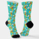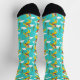 Add some fun to your feet with these patterned socks. The camp retro style pattern features illustrations of a western cowgirl and horse in bright yellow, red and blue against a bright aqua blue background.