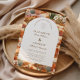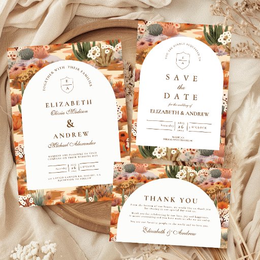 A refined western-inspired design featuring warm desert florals, cacti, and earthy botanicals arranged in a rich, painterly composition. The arched layout adds a timeless architectural feel, balancing the bold surrounding pattern with a clean, elegant center. Terracotta tones, soft neutrals, and muted greens create a grounded yet romantic palette—perfect for a modern desert or western celebration. Ideal for couples who want something unique, artistic, and effortlessly sophisticated.