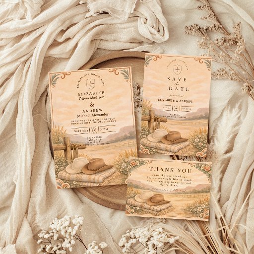 A rustic western wedding design inspired by desert landscapes, warm earth tones, and vintage botanical details. Featuring a sun-washed desert scene, wooden fencing accents, and soft florals, this invitation is perfect for ranch weddings, western celebrations, or couples planning a desert-inspired ceremony. Elegant, timeless, and fully customizable for your special day.