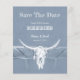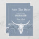 Budget rustic western dusty blue white country vintage antique distressed texture cowboy style. Fun wedding save the date flat cards. Bull cow skull invitations. Use a little humour with this cute, funny farmhouse inspired design. Typography can be customised. Old wild west, unique. Cool, trendy farm animal. Personalise script and typography. Image copyright Marg Seregelyi Photography.