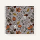 This elegant autumn notebook features hand-drawn illustrations in black ink, featuring a western Fall Harvest scene with cow skulls, roses, pumpkins, autumn leaves, branches and berries, all in an elegant fall colour scheme. Taupe grey background.