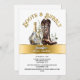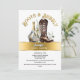 A tooled leather single brown leather cowgirl boot has white floral etchings on it and white summer daisy flowers around it. The boot has a beautiful faux gold and silver bottle of bubbly next to it and a champagne flute set above a faux gold horizontal band edged with a golden trim set against a white background. Editable gold, black and white text templates may be personalised to suit your special celebration. This stylish dowloadable invite is ideal for a western themed, country "boots and bling" or "boots and bubbly" special event too.