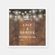 These rustic wedding paper napkins featuring horseshoes and string lights on a barn wood background can be personalized with your information in stylish typography. Designed by Thisisnotme©