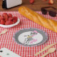 Western themed party plates with a cowgirl, horse and saddle on the fence with pink bandanna trim.