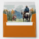 Western Ranch Autumn Envelope with Cowboy Liner perfect for your Coordinated Wedding Invitation or Save the Date cards. A great way to impress your guests with this special addition to your invitation suite. A cowboy gazes into the scenic watercolor range ranch with mountains and fall colours. A cowgirl approaches from the distance. Cowboy romance on the ranch! A memorable way to enclose your Save the Date card or Western Ranch Wedding invitation.