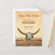 Rustic western country vintage beige brown antique cowboy rodeo style scenery background. Fun wedding save the date postcard. Bull cow skull invitations. Use a little humour with this cute, funny farmhouse design. Old wild west, unique. Cool, trendy farm animal. Customise your script. Image copyright Marg Seregelyi Photography.