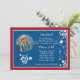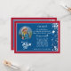A blue invitation double-framed with white and red. The circular picture window is embellished with a western hint of stars and swirls. Suitable for either gender and any age. The card is easy to customise with your wording, font, font colour and choice of six paper types.