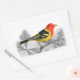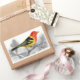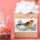 Vintage drawing of a Western Tanager bird with a red head and yellow breast on a grey background. This coloured drawing of the Western Tanager is from the old fashioned Arm and Hammer Baking Soda advertising card series.