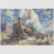 A horrifying moment in the Wild West, where a group of daring outlaws on horseback chase an old locomotive across the desert. The train, billowing white smoke, races along the tracks, its polished brass and red metal gleaming in the sunlight. The outlaws, clad in classic western attire, are in hot pursuit, kicking up dust as they gallop alongside the train. This dynamic scene is set against a backdrop of towering rock formations and sparse greenery, evoking the untamed spirit of the frontier and the legendary tales of train robberies. RHDesigns created decoupage papers for furniture, canvas, poster art and home decor.