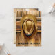 Western Wedding Invitations - features an elegant, rustic door with vivid wood grain detail. A large brown - suede cowboy hat hangs on the door. Below a western theme font is used for the demo wedding date. The back of the invitation demo features the same door with aged, old paper hanging from it by a red thumbtack. You can change the font, sizing, colours or even the wording to what ever you prefer. You can also move around the text boxes or add more if you would like. Use the orange customise button below the invitation demo. If you are satisfied with the font colour, style and sizing, just use the personalise feature to the right of the invite demo to get started. The card demo is set to basic wedding invitation paper, if you would like linen, or other finer grades, use the customise orange button to make the necessary changes Each invitation comes with a white envelope. If you love the design, be sure to check out "natureprints" or "store" above to find matching RSVP cards, save-the-dates and more.