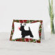 Fun Westie Christmas Card has a dog breed silhouette, with reindeer antlers and a bright red glowing nose. The background is a cheery holiday plaid with reds and greens. The inside reads, "Wishing you and your family a wonderful holiday season!" Personalise the message to your own easily. Cute dog lover Christmas cards.