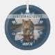 Stylish modern holiday ornament with cat name featured in fun typography in white on a blue background, over your cutest cat photograph. All framed in a pretty flower shape. Christmas 2025 on the face of the classy ornament.