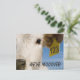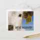 This funny postcard features a photo of a cute calf with a numbered tag and the customisable message "We've MOOOVED. Photography created by award-winning photographer Maria Jeffs.